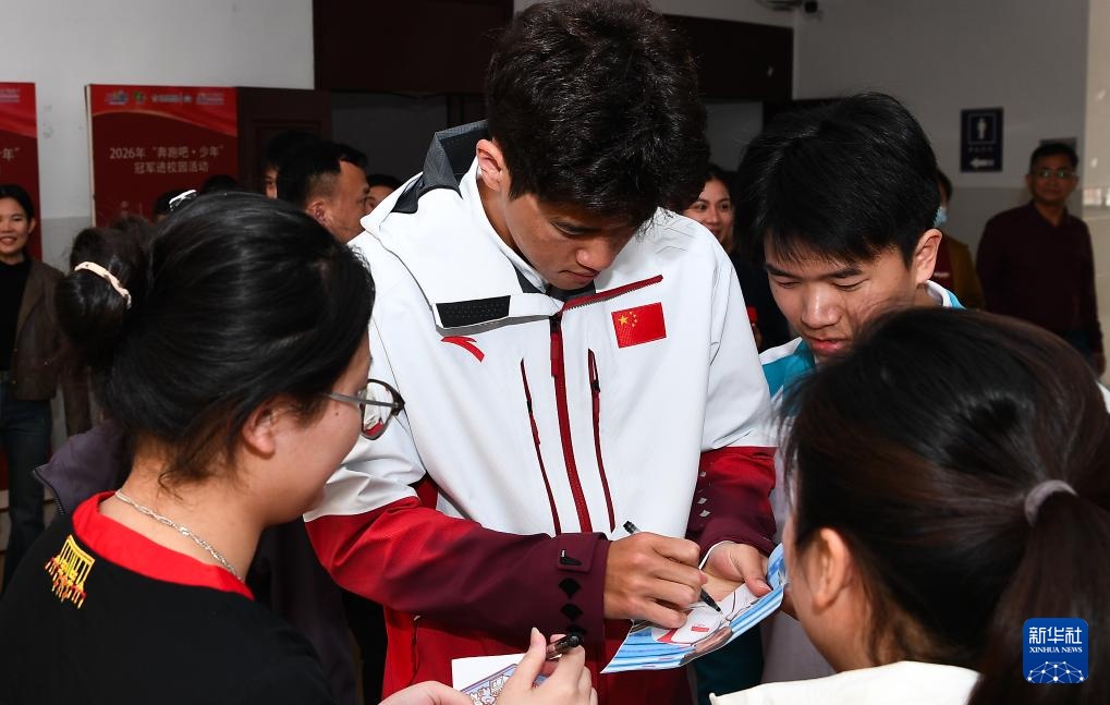 1月5日,潘展乐在活动结束后为学生签名。新华社记者 杨冠宇 摄
